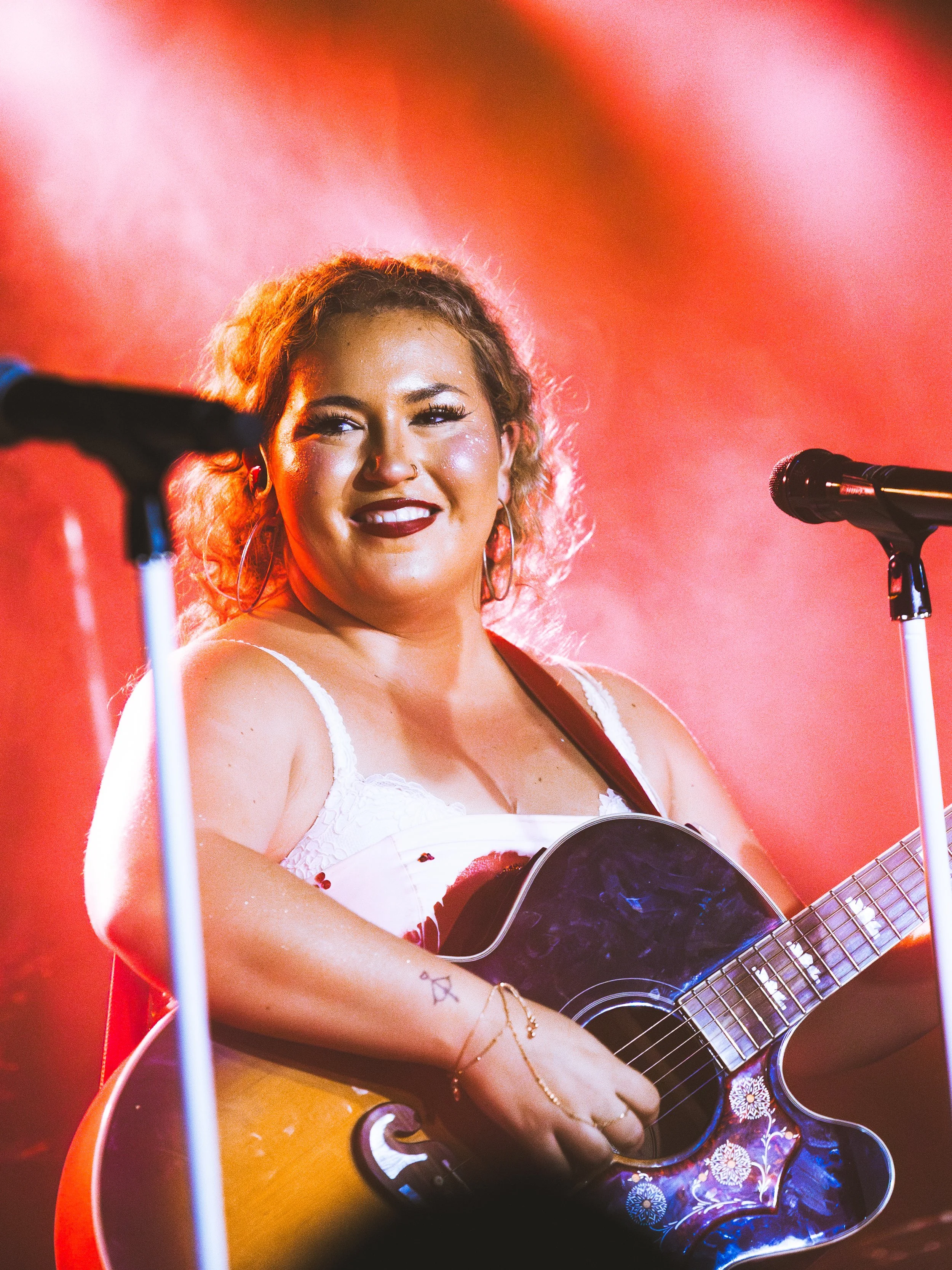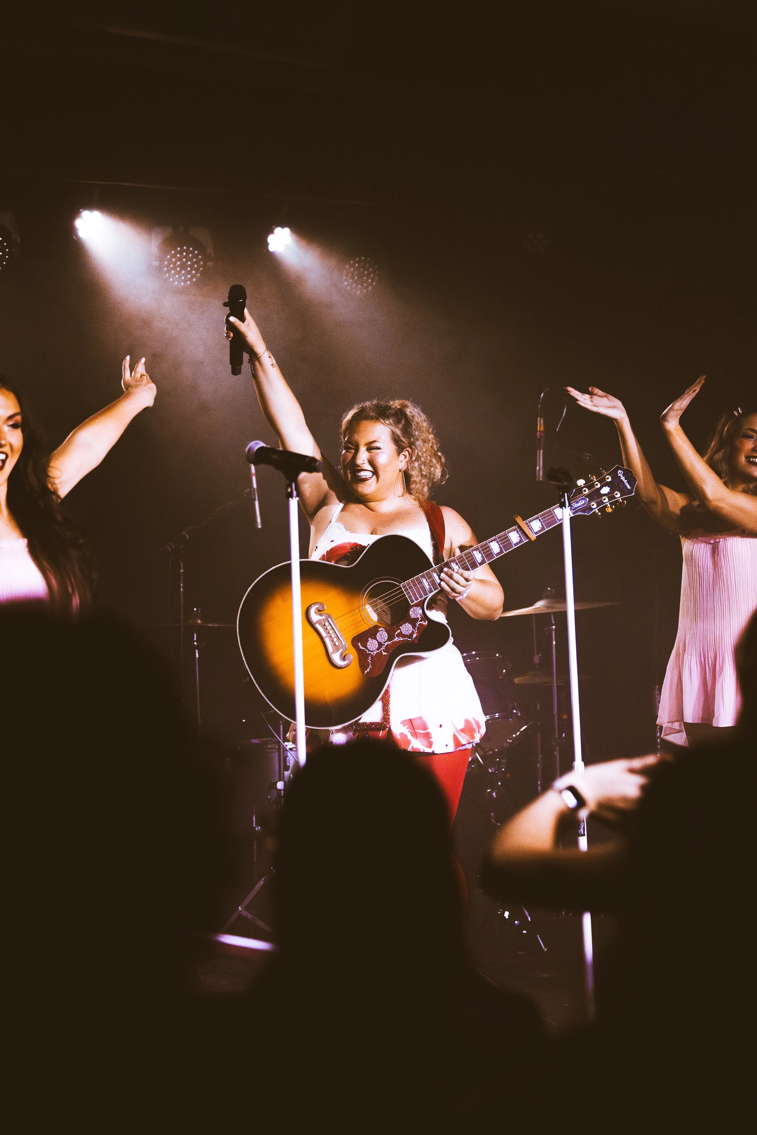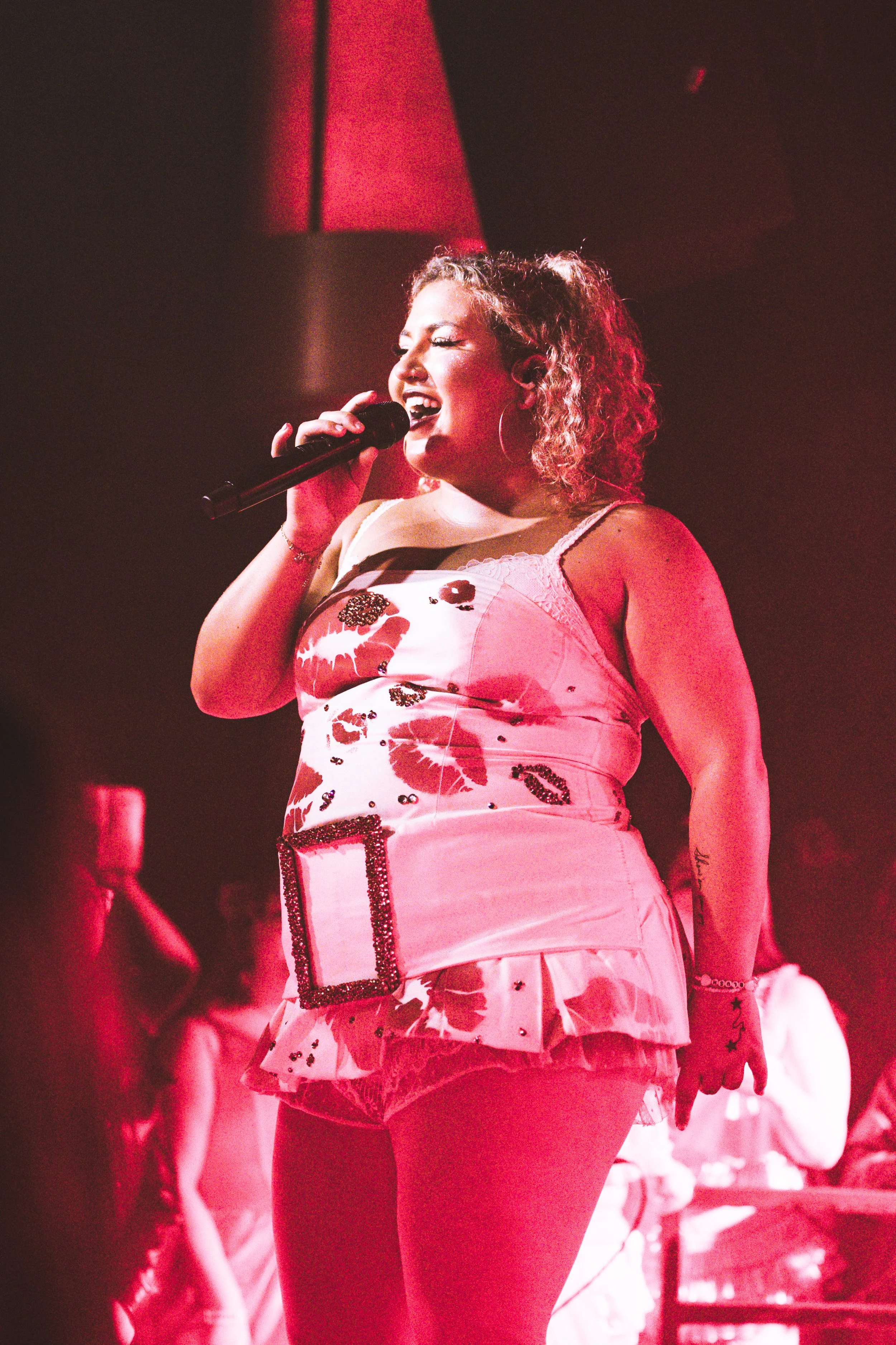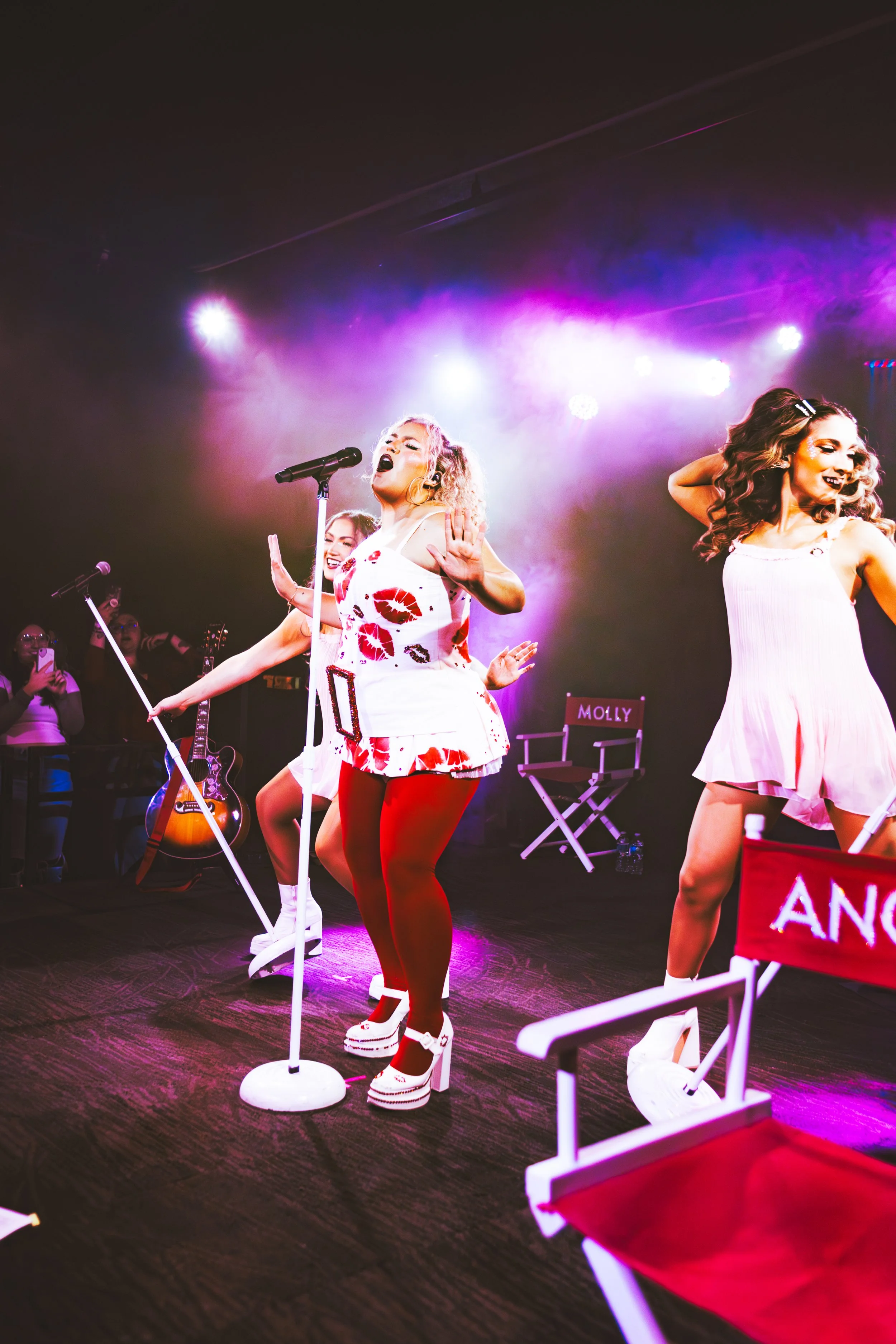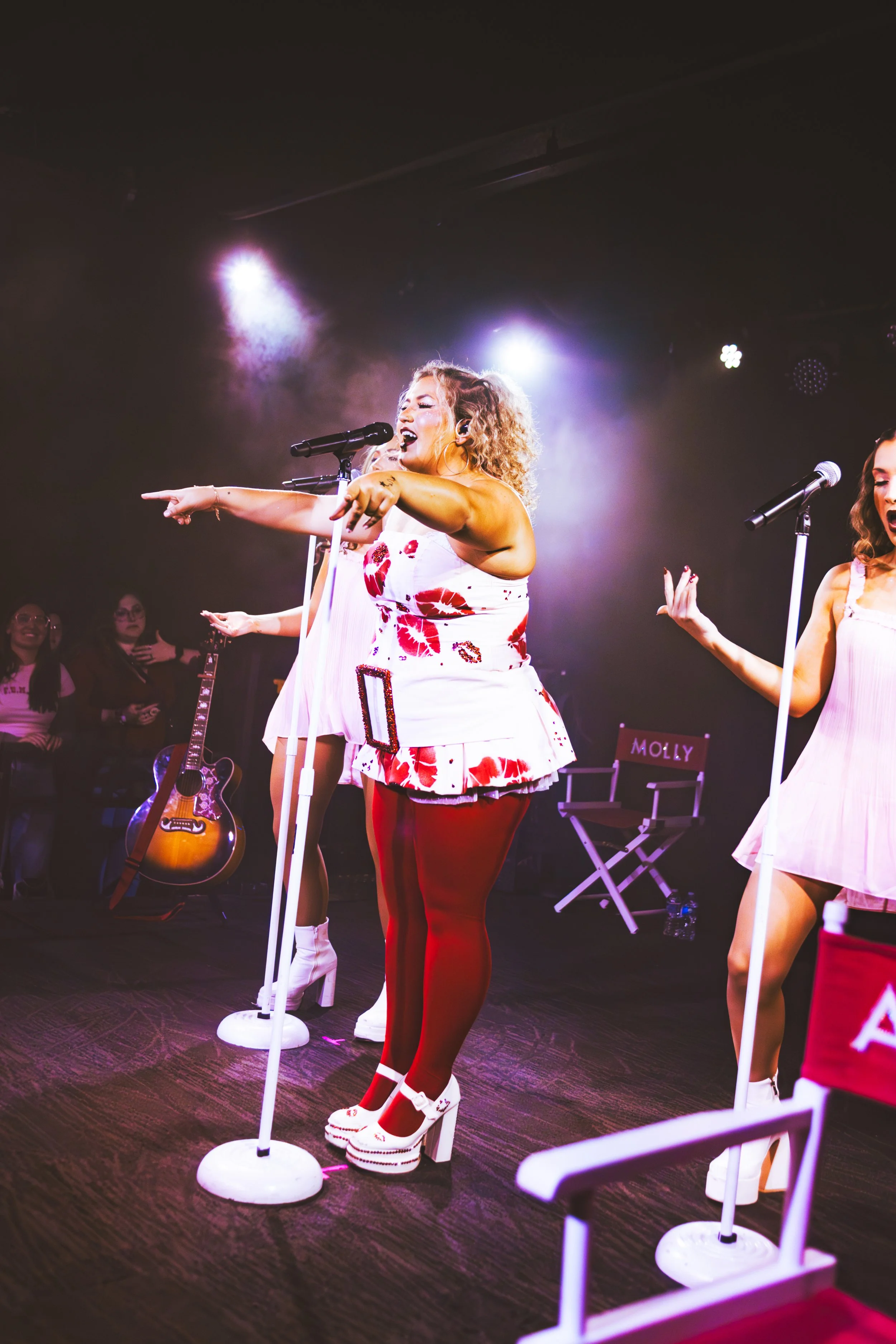 When Molly stepped on stage in a short white dress covered in kiss marks with bright red tights, she looked adorable and the crowd lit up right away. One of the sweetest moments of the night came when she stepped away from the mic, sat close to the audience with her guitar, and performed completely unplugged. The room went quiet in the softest way, everyone leaning inas her voice carried naturally. It made the venue feel small and cozy, almost like a living room performance with friends.